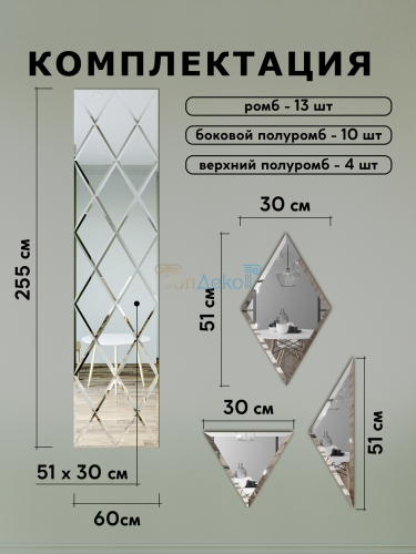 Зеркальное панно из зеркальной плитки ромб 30х51 см с фацетом 10 мм (размер 60х255см)